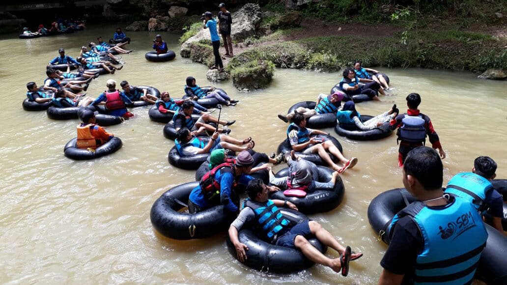 Setelah mandi dan sarapan pagi (ada juga yang sarapan dulu sebelum mandi, hehe) para peserta Gathering sudah berkumpul dan bersiap-siap untuk menuju Obyek Wisata Goa Pindul. Sebelum basah-basahan, kami melakukan pemanasan terlebih dahulu sambil diisi dengan Fun Game. Setelah cuaca cukup panas, tibalah saatnya kita melakukan Body Rafting di Goa Pindul. Tapi sebelumnya kita santap makan siang dulu agar perut bersahabat. Maklum peserta Ghatering pada doyan makan semua, haha.