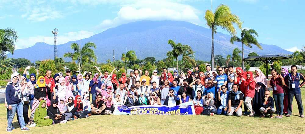 Setelah selesai berenang dan sarapan, sebelum meninggalkan hotel ngga lupa dong yaa kita foto bersama dulu dengan view gunung Ciremai. Caaaantiiik sangaaat.